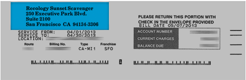 San Francisco customers are serviced by three companies: Recology Sunset Scavenger, Recology Golden Gate, and Recology San Francisco. Your service provider’s name is listed on the top third of your bill. Click the image to see where your Recology company’s name appears on your bill.